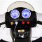 Сиденье кожаное, набивное, удобное. Большие подставки для ног, под правой располагается педаль скорости. Задний привод. Движение происходит от нажатия педали (одна вперед и назад). Два режима езды — медленный (до 3 км/ч), и быстрый (до 6 км/ч), а так же, задний ход, сможете выбрать сами. На панели есть разъемы Aux, сможете прослушать любимые песни через шнурок с плеера или телефона. Ручки удобные, руки не скользят т.к. на них прорезиненные накладки. Управлять может, только ребенок. Мотор включается с кнопки, после чего начинается рев двигателя. Пульта ДУ нет. Горят передние и задние фары, вечером смотрится эффектно, плюс приборная подсветка подсвечивается. Вы спокойно можете выехать на природу, не переживай ни за что. На настоящий, его делают похожим все элементы цвета хром - колпаки на колёса, имитация мотора и радиаторная решетки, а сама рама из стали, что говорит о надежности конструкции.