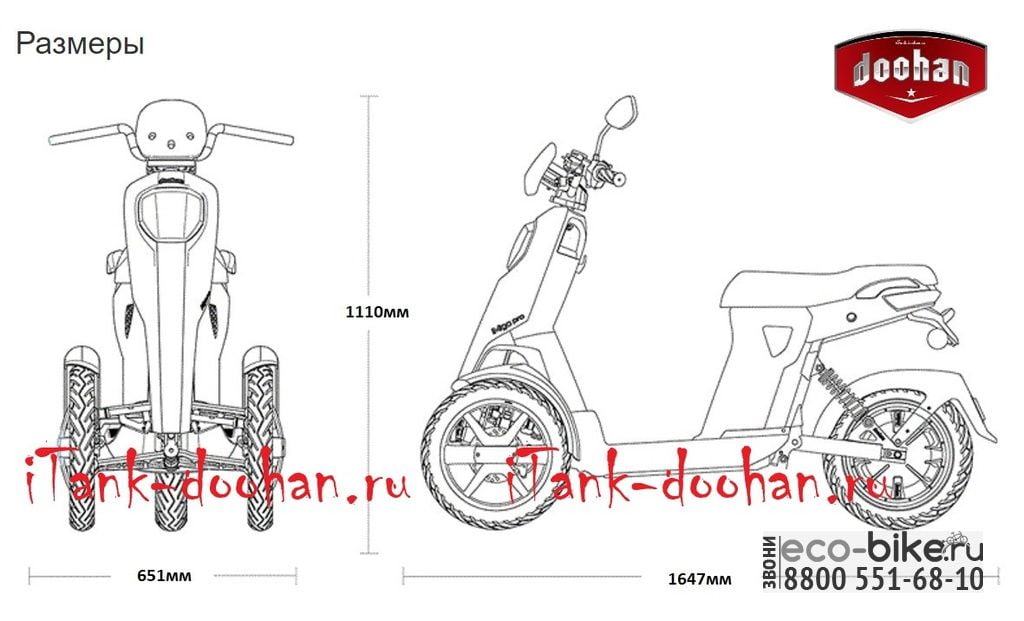 iTango Classic 1000W с с высотой дорожного просвета 15 см отлично преодолеет труднопроходимые маршруты во многом благодаря хорошему протектору и размеру шин, спереди стоят 80х100 R12 сзади 120х70 R12.