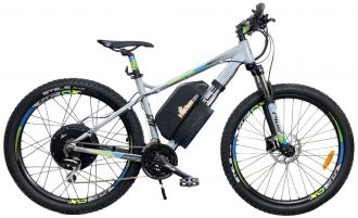 - оснащен 1500 ваттным мотором, разгоняющий велосипед до 60 км/ч;
